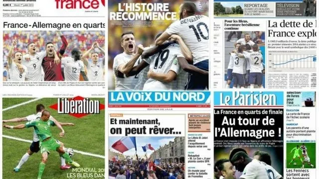 « Les Bleus en quarts », titre Ouest-France et « Rendez-vous avec l'Allemagne », « Place à l'Allemagne », titrent de leur côté en Une la Charente Libre et le Courrier de l'Ouest pour ce qui sera « un choc », prévient La Provence.