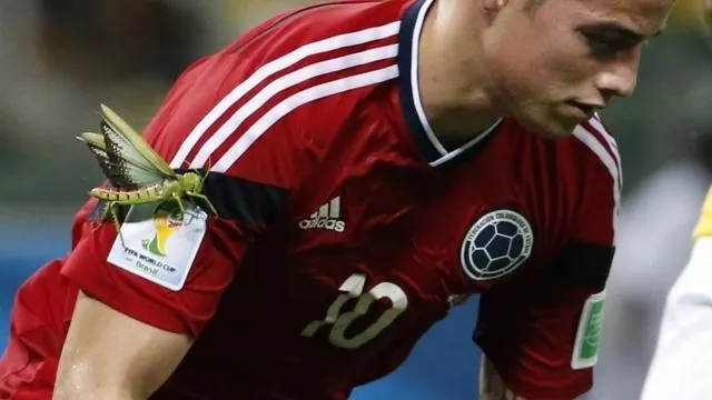 Buteur sur penalty face au Brésil, le Colombien James Rodriguez avait une groupie sur son maillot : une énorme sauterelle avait pris