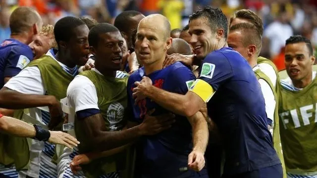 Arjen Robben (au centre) et Robin van Persie (qui le félicite, avec le brassard de capitaine) ont chacun inscrit un doublé et complètement fait exploser l'arrière-garde espagnole. © Reuters