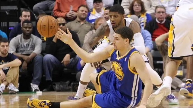 Klay Thompson (Golden State) a réalisé la plus action cette nuit face à Paul George et Indiana © USA Today Sport