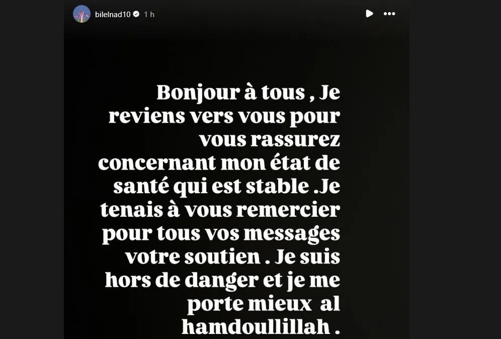 Billa Nadir a publié un message rassurant sur son compte Instagram, ce vendredi 31 octobre. @bilelnad10 / Instagram