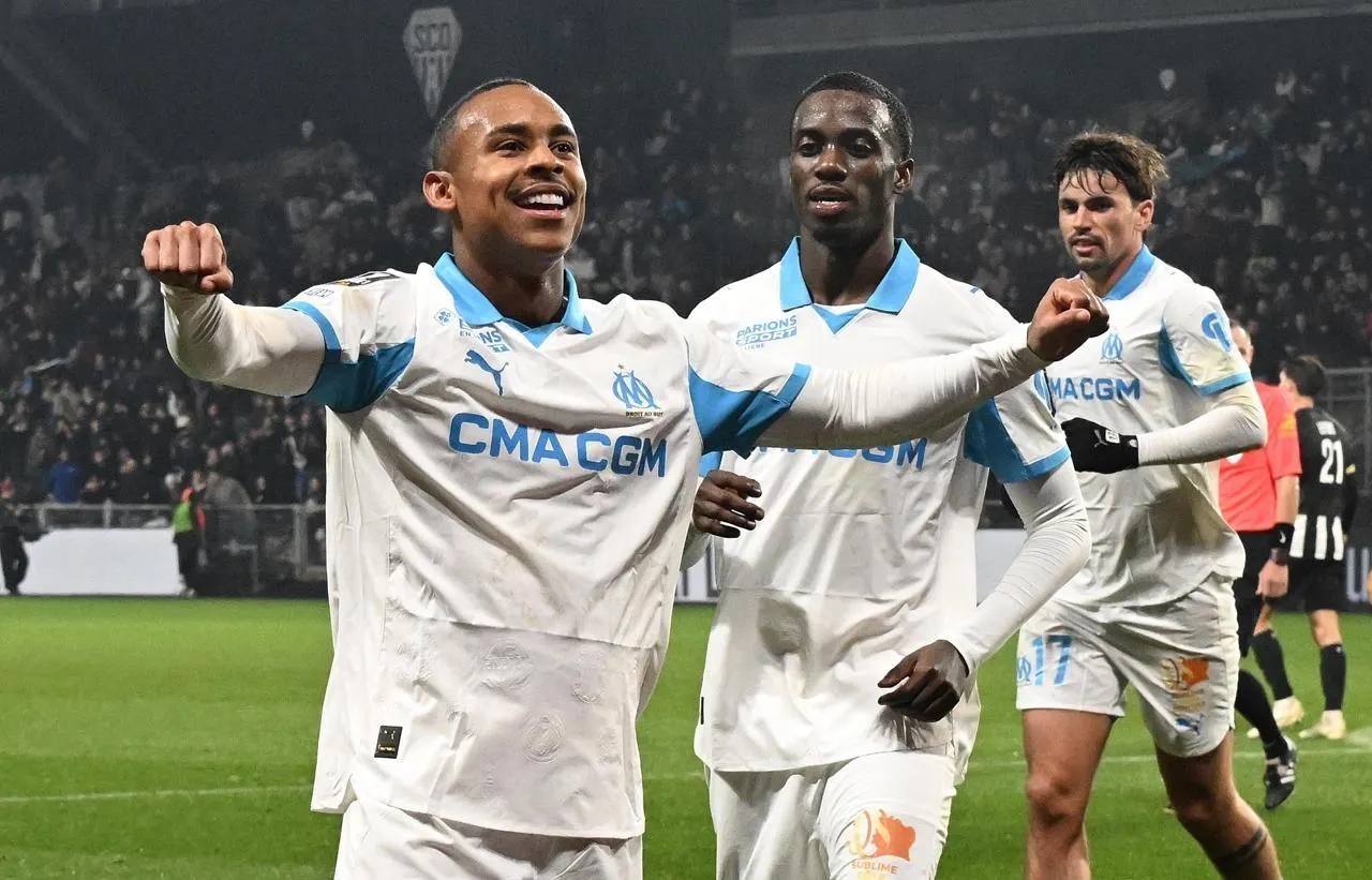 La joie des joueurs de l’Olympique de Marseille après le but de Paixao, face au SCO Angers, défait 2-5 à domicile, samedi soir 17 janvier 2026. © Jérôme Fouquet/Ouest-France