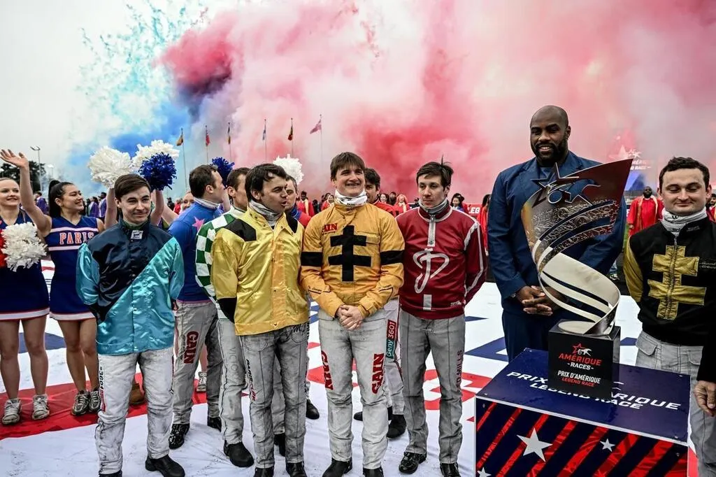 Le champion olympique de judo Teddy Riner était l’invité surprise du Prix d’Amérique Legend Race. À gauche, avec la casaque bleue, Benjamin Rochard, 6e dans le prix d’Amérique 2025. © Martin ROCHE / Ouest-France