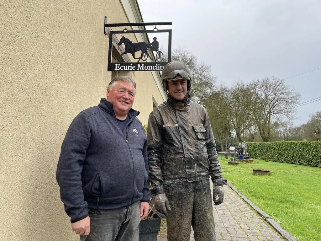 Jean-Marie Monclin (à gauche), et son fils Jean-Philippe qui aura son premier partant comme entraîneur dans le prix d’Amérique 2025, à l’hippodrome de Paris-Vincennes. © Ouest-France