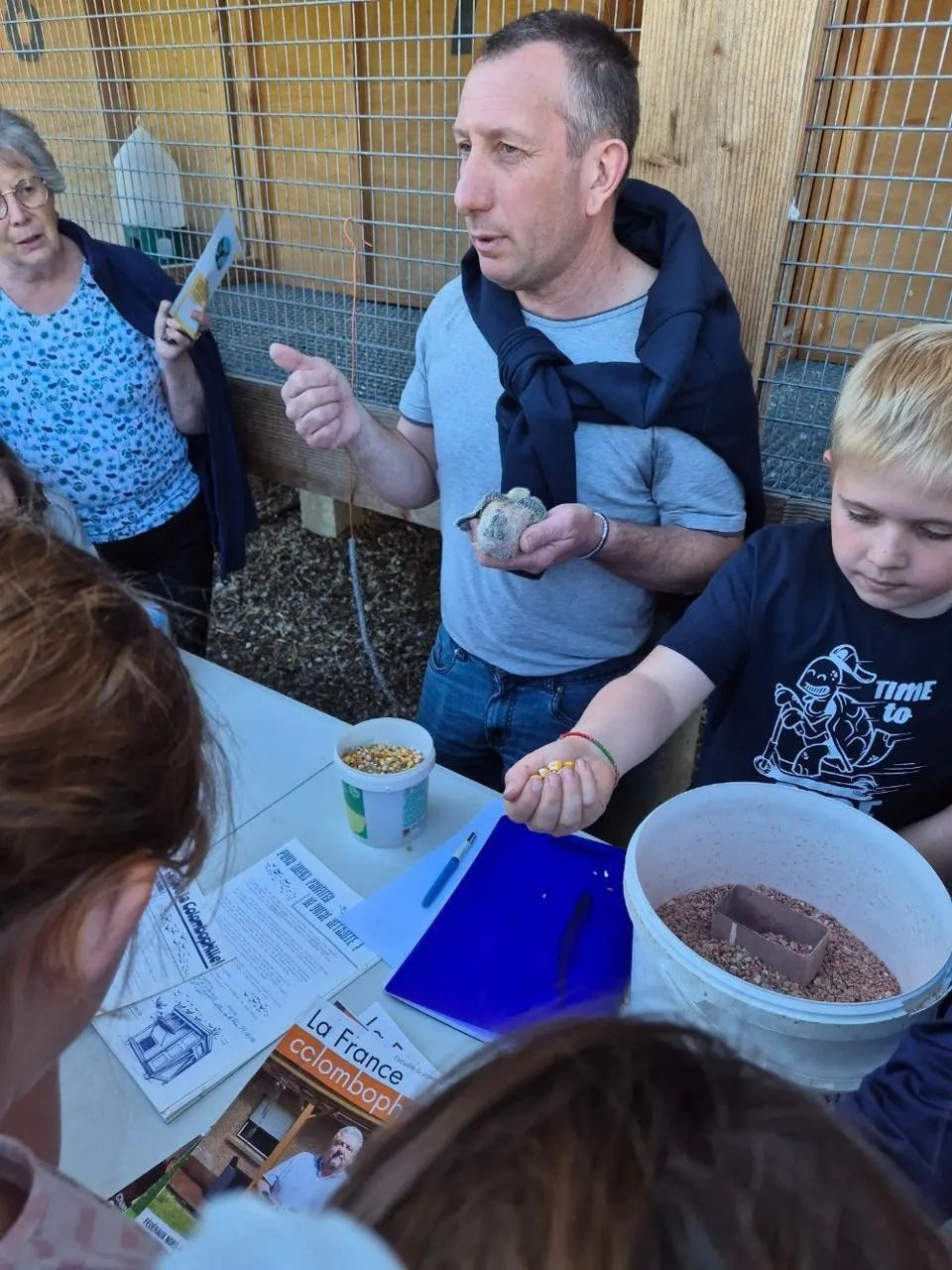 Les pigeons voyageurs qui parcourent de longues distances ont besoin d’une alimentation riche en protéines, vitamines et minéraux. Mickaël Esnault a ainsi invité les enfants à répartir grains de maïs, blé et pois de manière équitable. © CO