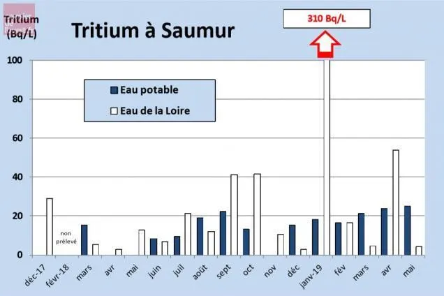La concentration de l’hydrogène radioactif (tritium) a été relevée à 310 becquerels par litre (Bq/l) dans l’eau de la Loire en janvier 2019, selon l’Association pour le contrôle de la radioactivité dans l’Ouest (Acro). La France a pourtant fixé son seuil d’alerte à 100bq/l pour l’eau de consommation. En septembre 2018, les taux diffusés par ce même réseau de « surveillance citoyenne »