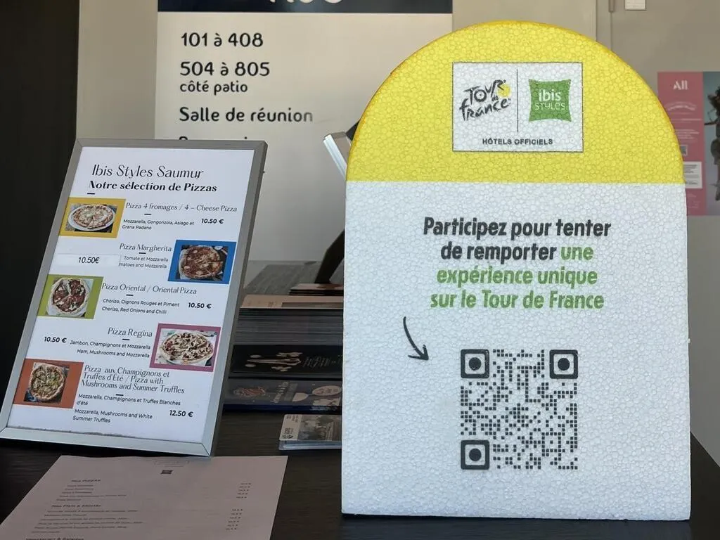 La directrice de l’Ibis Styles de la gare de Saumur, Cathy Lucas, annonce la couleur à l’entrée de l’hôtel, pour la 9e étape du Tour de France. © CO