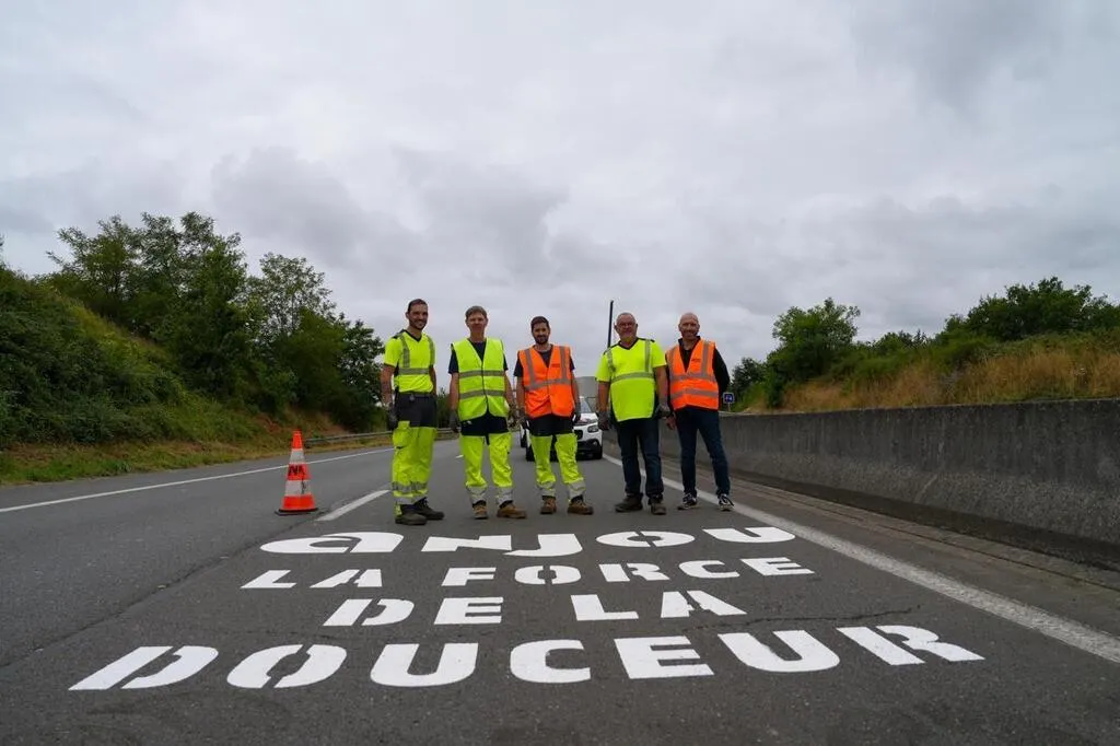 « Anjou, la force de la douceur ». La marque adoptée début 2024 - elle a coûté 62 000 € - par le département de Maine-et-Loire a été peinte mardi 22 juillet sur les routes angevines qui accueilleront le Tour de France femmes le 28 juillet prochain. Des opérations du marquage sur le sol se sont notamment déroulées dans les secteurs de Terra Botanica, de Cantenay-Épinard et Montreuil-Juigné. Des opérations similaires se dérouleront ce jeudi dans le Segréen.