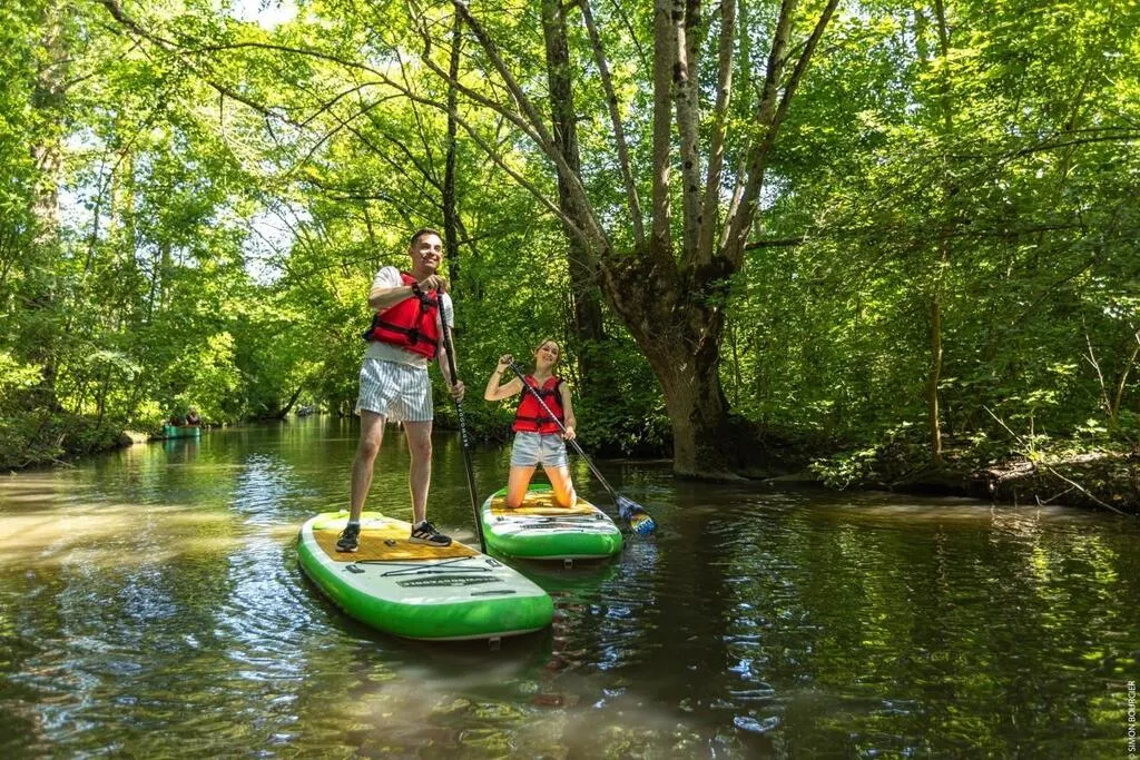 De nombreux embarcadères jalonnent le marais Poitevin et proposent des balades avec ou sans guide. Mais il existe une autre manière originale, également respectueuse de l’environnement, à la fois zen et sportive, de découvrir la faune et la flore du marais : le stand-up paddle. En équilibre sur une longue planche, la position debout permet de prendre un peu de hauteur sur les paysages du marais mouillé et réserve une autre perspective adaptée au rythme lent de la pagaie.